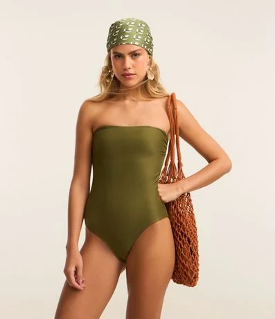 Maiô feminino confeccionado em microfibra, sem alça, sem estampa e com busto drapeado. O item possui decote reto e medalhinha aplicada nas costas.