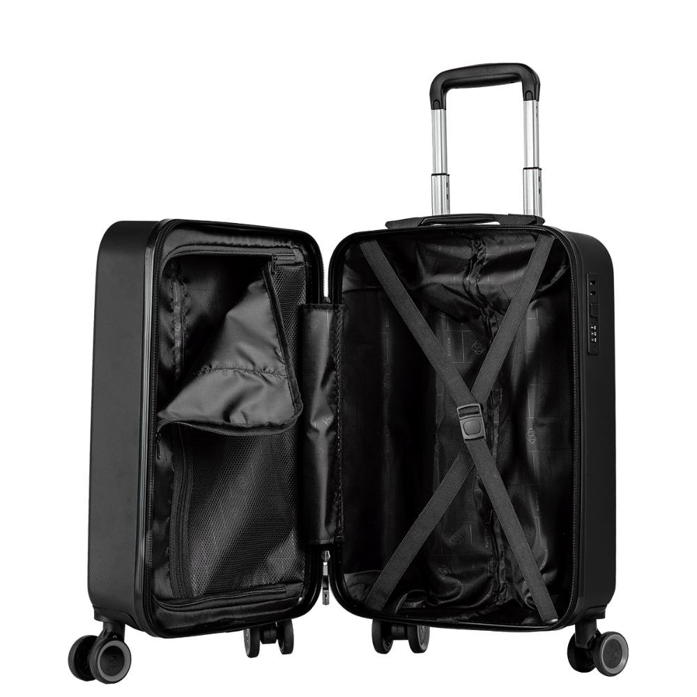 Seu formato rígido proporciona segurança para os pertences, enquanto o cadeado fixo flat com segredo oferece uma camada extra de proteção. O interior da mala é bem pensado, contando com uma divisória interna com zíper e um elástico que mantém as roupas organizadas e seguras durante o transporte.