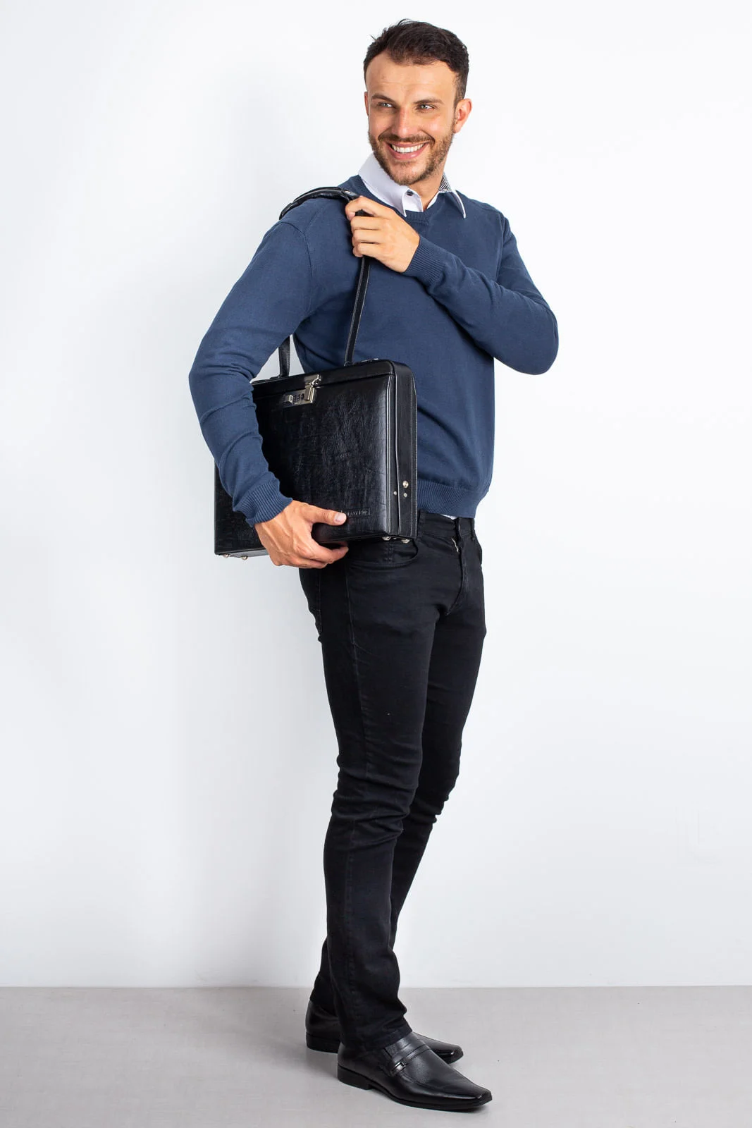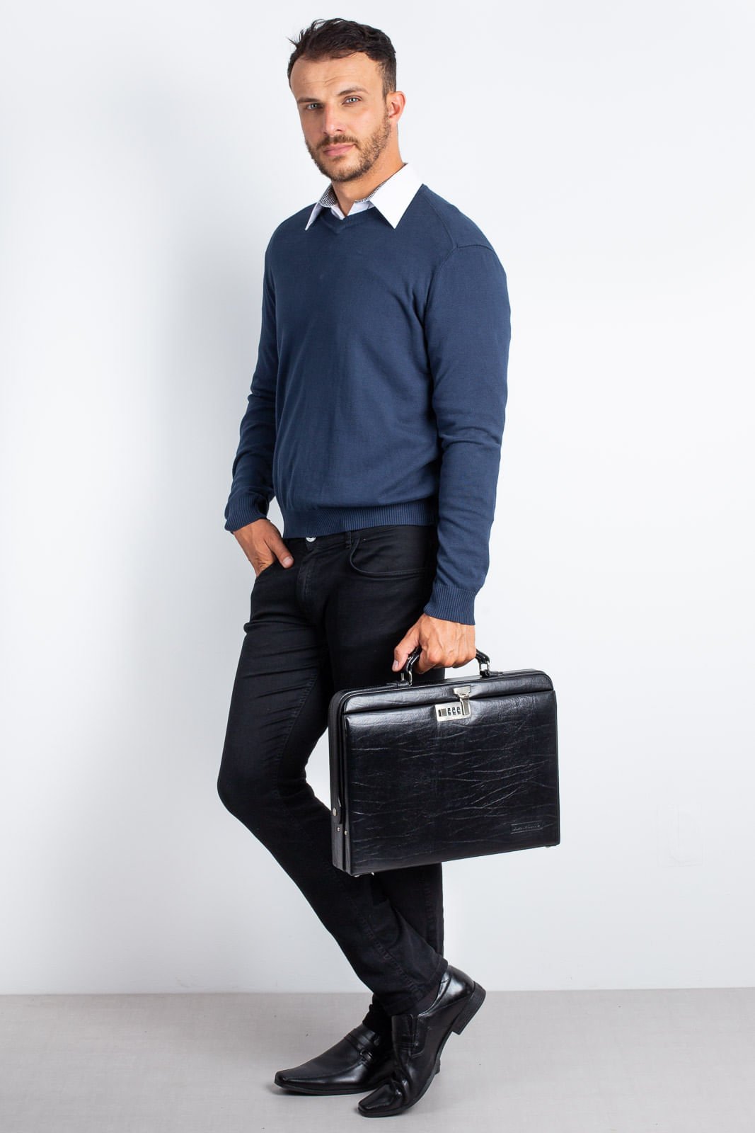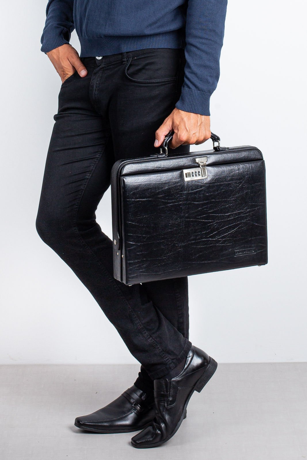 A capanga masculina e um modelo de pasta, porem de mao e tamanho medio, que serve para guardar documentos em um local seguro e organizado. Este modelo possui um bolso frontal e uma divisoria interna com porta-cartoes, alem de uma alca retratil. A capanga e fabricada em couro legitimo, e possui chave opcional para fechamento.
