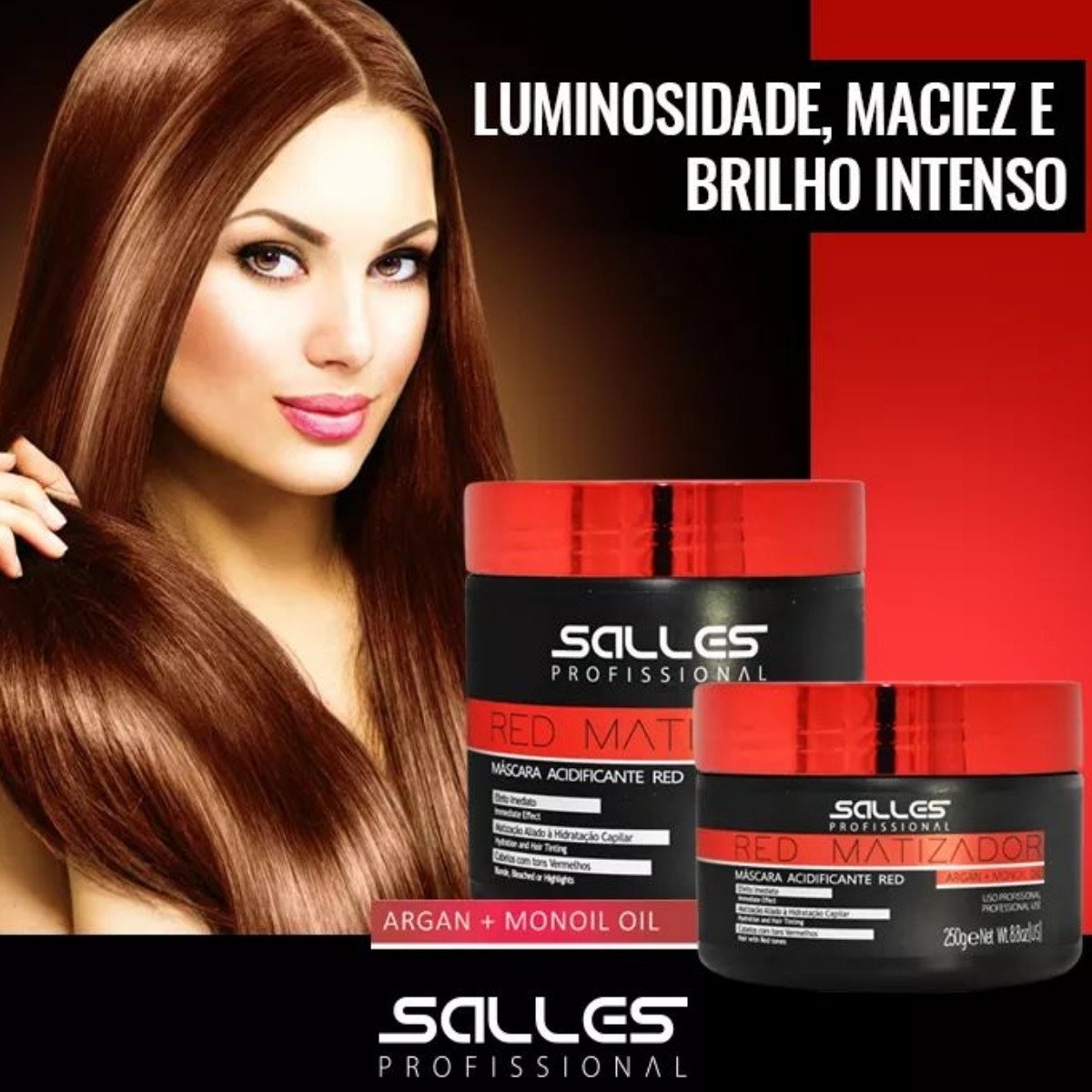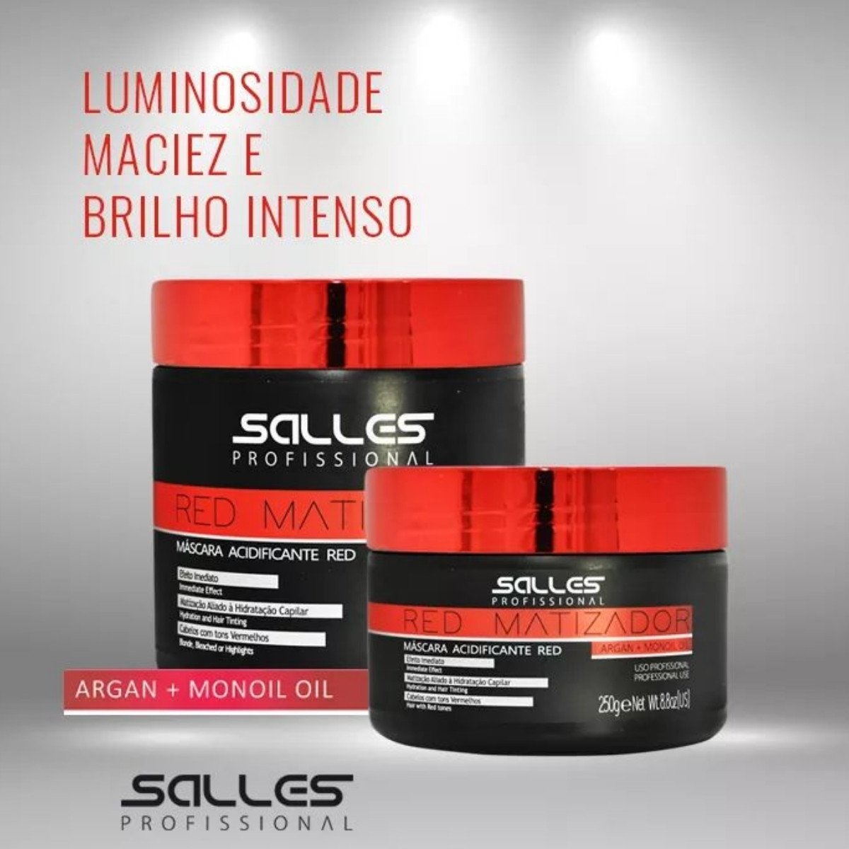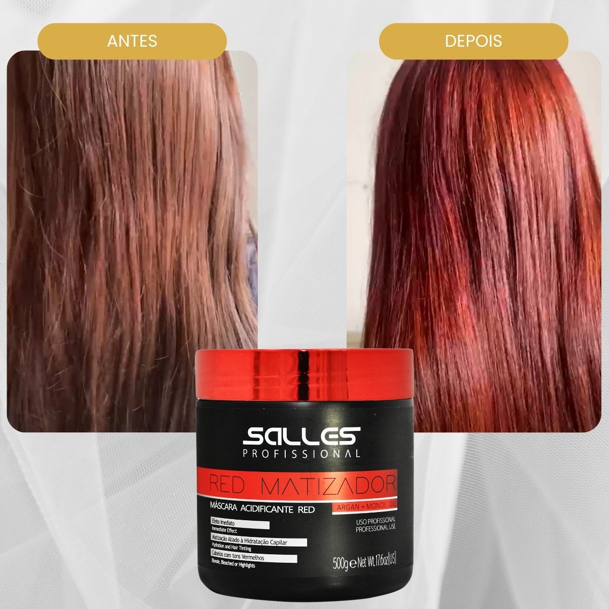 Mascara Red Matizadora - 500g Realce e Protecao para Cabelos VermelhosA Mascara Red Matizadora Salles Profissional 500g foi desenvolvida para intensificar e prolongar a cor vermelha dos cabelos, sejam eles naturais ou tingidos. Sua formula exclusiva contem pigmentos vermelhos de alta performance que garantem cor uniforme, vibrante e livre de desbotamento precoce.Alem da acao matizadora, oferece hidratacao profunda e nutricao intensa, com ativos como Oleo de Argan, Pantenol e Manteiga de Karite, que tratam a fibra capilar, recuperam a maciez e proporcionam um brilho radiante. Beneficios: Intensifica a cor vermelha e evita o desbotamento Hidrata e nutre profundamente os fios Deixa o cabelo macio, sedoso e com movimento natural Realca o brilho e a vitalidade da cor Trata enquanto mantem a beleza da coloracao Ativos Principais: Pigmentos Vermelhos de Alta Fixacao: Proporcionam cor intensa e duradoura Oleo de Argan: Repara e nutre profundamente Pantenol: Mantem a hidratacao e elasticidade Manteiga de Karite: Protege e suaviza os fios Indicacao: Indicada para cabelos vermelhos, ruivos ou acobreados, naturais ou coloridos, que necessitam de manutencao de cor e tratamento nutritivo. Modo de Uso: Lave os cabelos com shampoo e retire o excesso de agua. Aplique a mascara uniformemente, do comprimento as pontas. Deixe agir de 5 a 10 minutos, conforme a intensidade de cor desejada. Enxague completamente. Utilize semanalmente ou sempre que precisar reavivar o tom. Resultado: Cabelos vermelhos vibrantes, hidratados e com brilho intenso, protegidos contra o desbotamento e a opacidade.