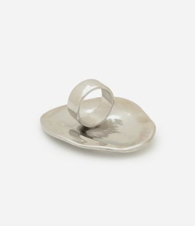 Maxi anel em chapa de metal martelada com banho níquel. Design marcante e sustentável para compor produções modernas com personalidade e toque artesanal.