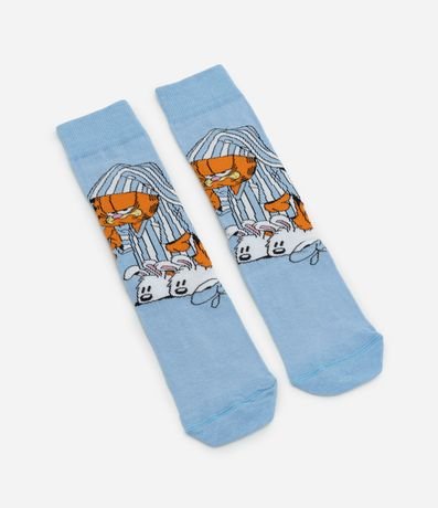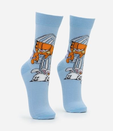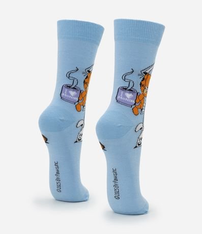 Ref: Par de meias de algodão com estampa do gato Garfield usando pijamas.