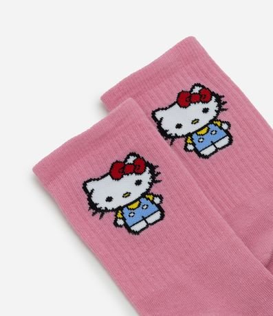 Meia feminina confeccionada em algodão mais sustentável através de boas práticas ambientais. Possui cano alto, detalhes contrastante com listra vermelha e estampa Hello Kitty.