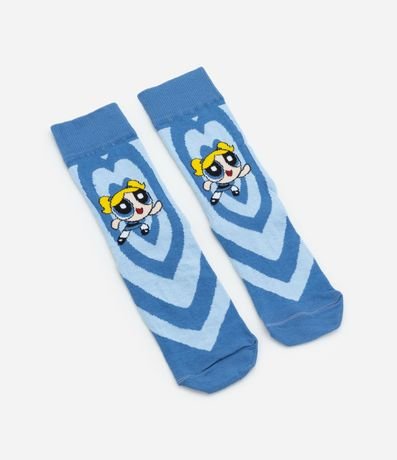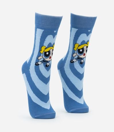 Meia feminina confeccionada em algodão com cano alto. Peça com estampa de listras que formam um coração e a personagem Lindinha, do desenho meninas superpoderosas, no centro.