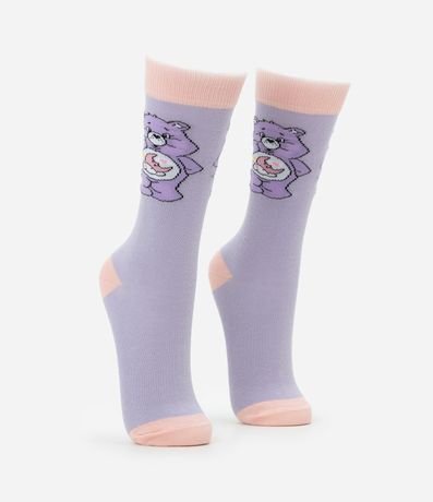 Meia feminina confeccionada em algodão mais sustentável com cano alto, detalhes contrastantes e estampa dos ursinhos  carinhosos.