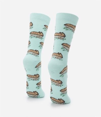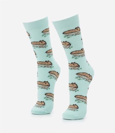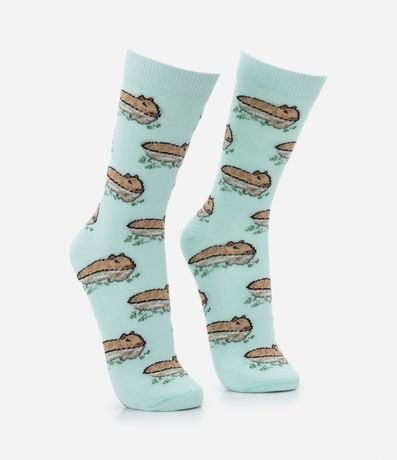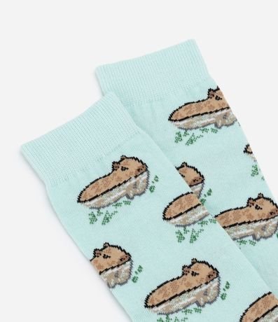 Ref: Par de meias masculinas confeccionadas em malha de algodão mais responsável, com cano alto e estampa divertida em repetição de capivara na lagoa.