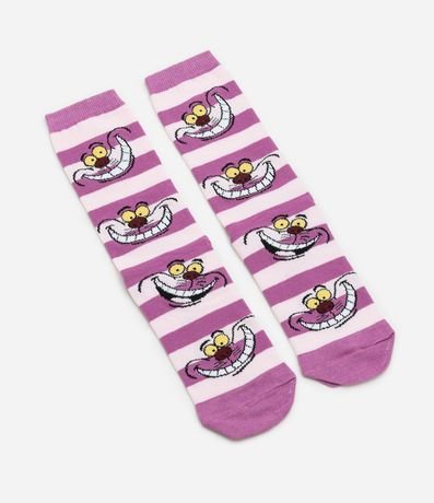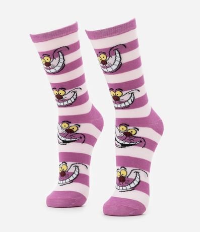 Ref: Par de meias confeccionadas em algodão mais sustentável com boas práticas ambientais. No modelo cano longo, peça contém estampa listrada com o icônico Gato da fabula Alice no pais das maravilhas.