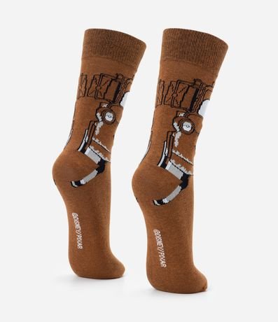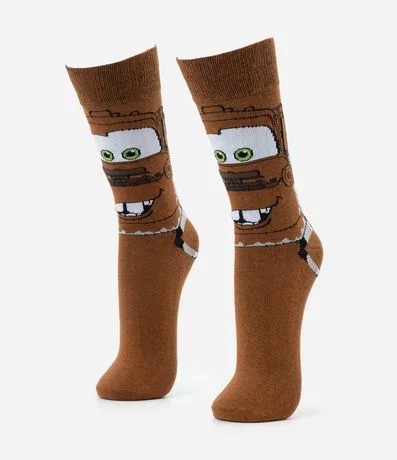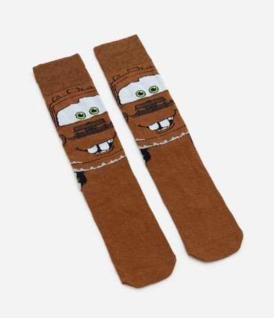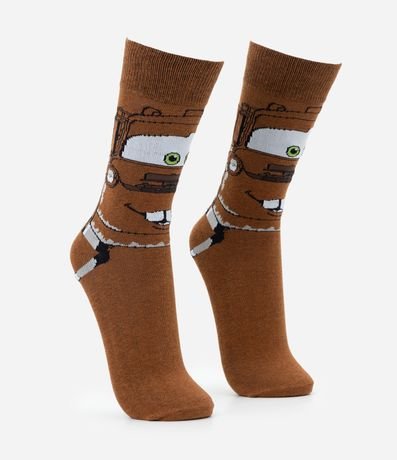 Ref: Par de meias masculinas confeccionadas em algodão certificado BCI e boas práticas ambientais. Modelo com cano alto e estampa divertida do personagem Mater, garantindo conforto e estilo para o dia a dia.