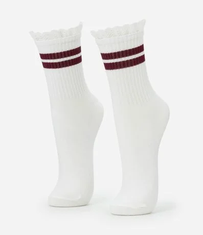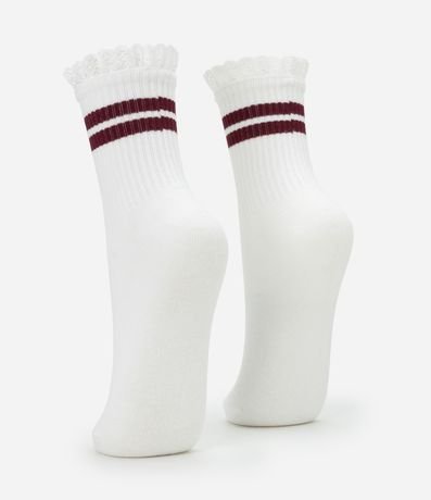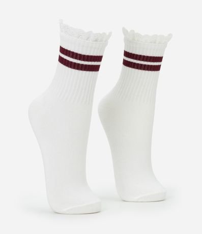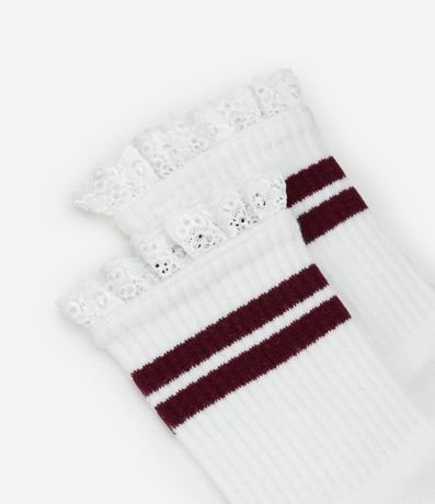 Ref: Par de meias de algodão com cano alto. As listras dão uma cara esportiva enquanto os babados de renda têm um jeitinho mais romântico: peça perfeita para montar looks athleisure.