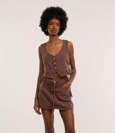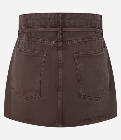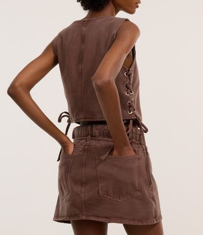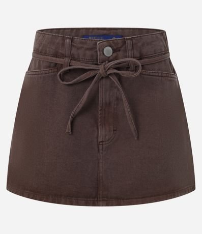 Ref: Mini saia em jeans com algodão bci e boas práticas ambientais, cordão para amarração no cós e tingimento cationizado.