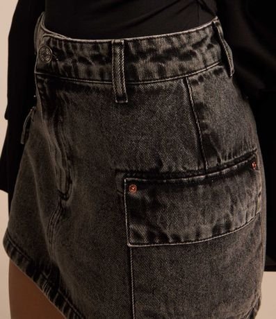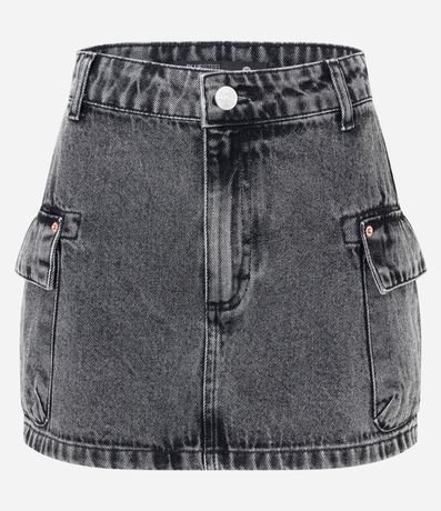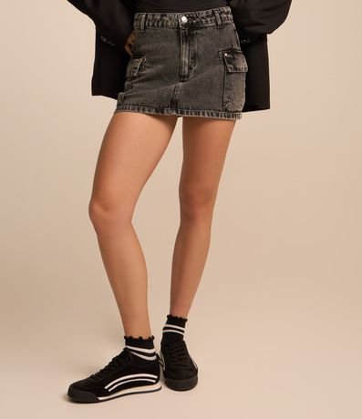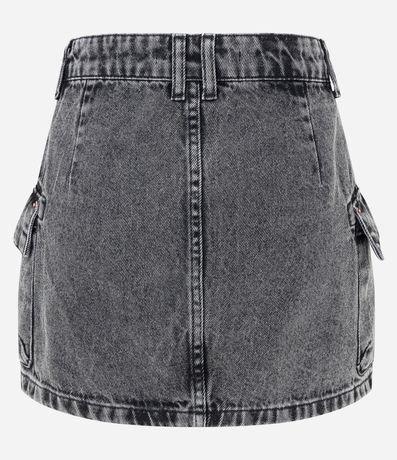 Ref: Mini saia confeccionada em jeans, marmorizada, cós com passantes e bolsos cargo na lateral.
