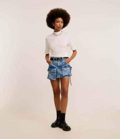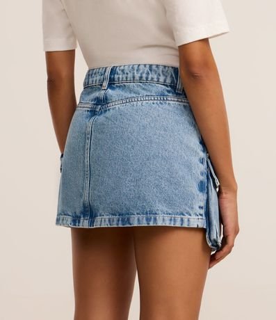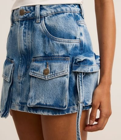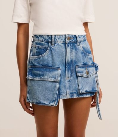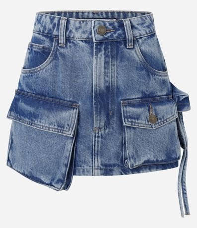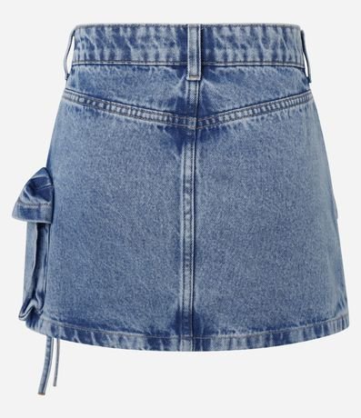 Ref: Mini saia confeccionada em jeans com algodão bci mais sustentável, com cintura baixa e bolsos cargo.