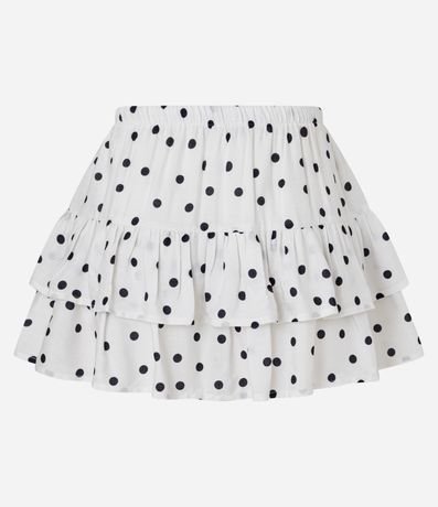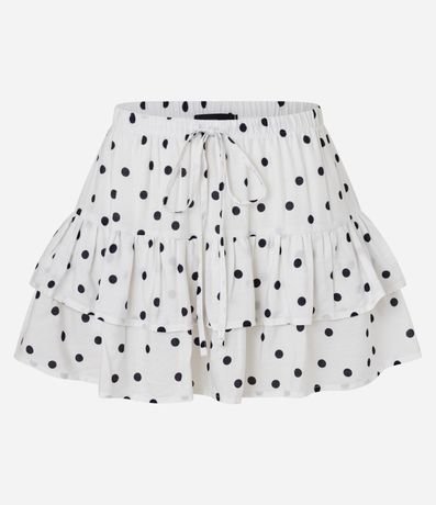 Ref: Short saia curtinho confeccionado em chalis - um tecido leve feito de viscose mais sustentável. A peça tem amarração no cós, babados na saia e estampa bicolor de bolinhas.