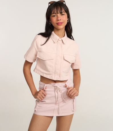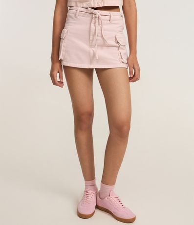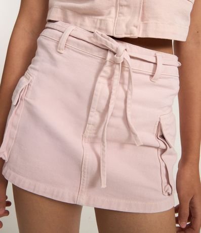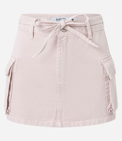 Ref: Saia curta confeccionada em sarja, de modelo mini saia, com passantes no cós e sem estampa. Possui bolsos cargo nas laterais e acompanha cintinho para amarração na cintura.
