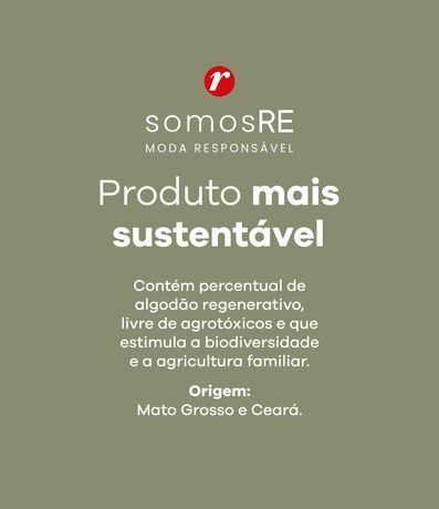 Produto contém percentual de algodão agroecológico, cultivado sem agrotóxicos e com cuidado com o solo e a água. Produzido por agricultoras apoiadas pelo Instituto Lojas Renner.