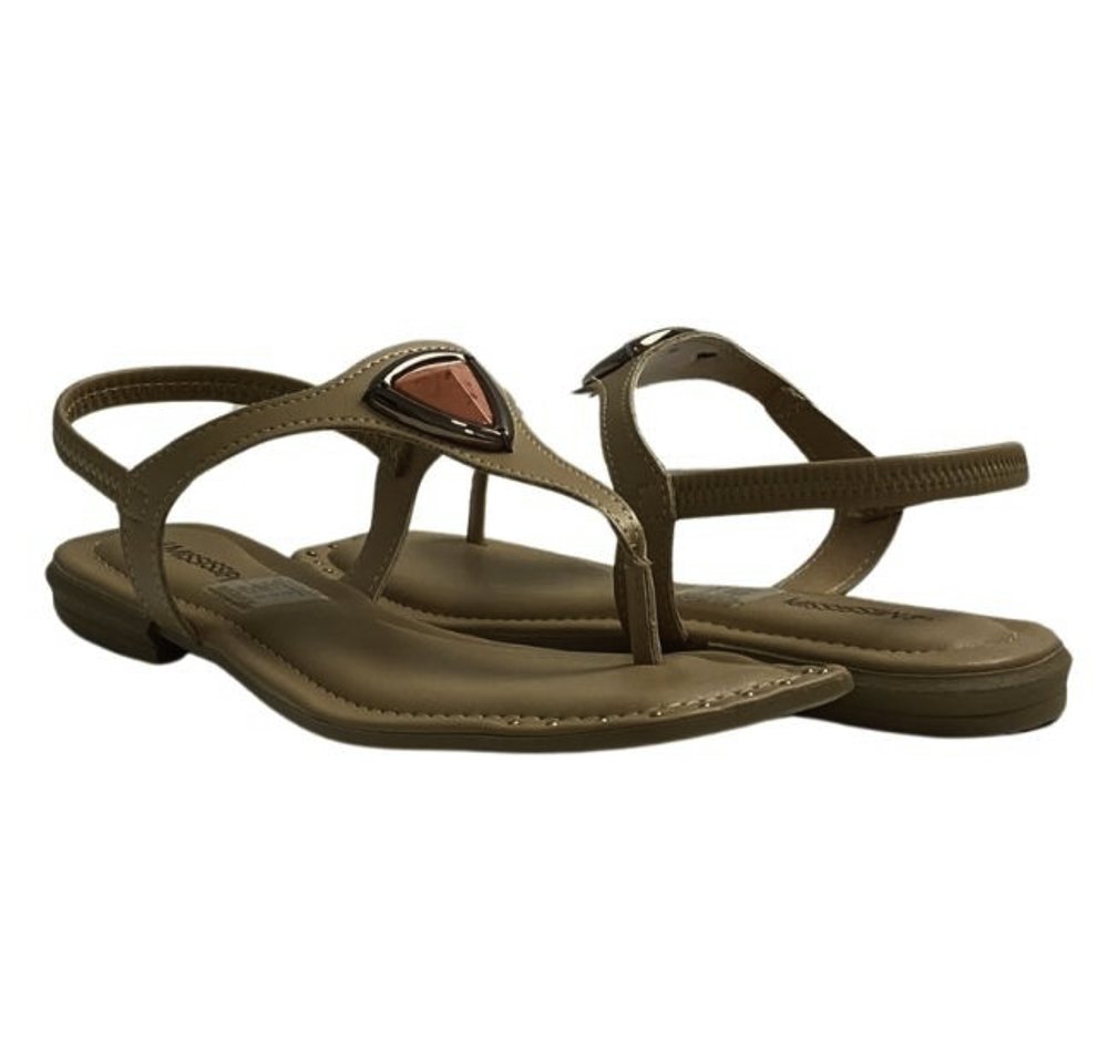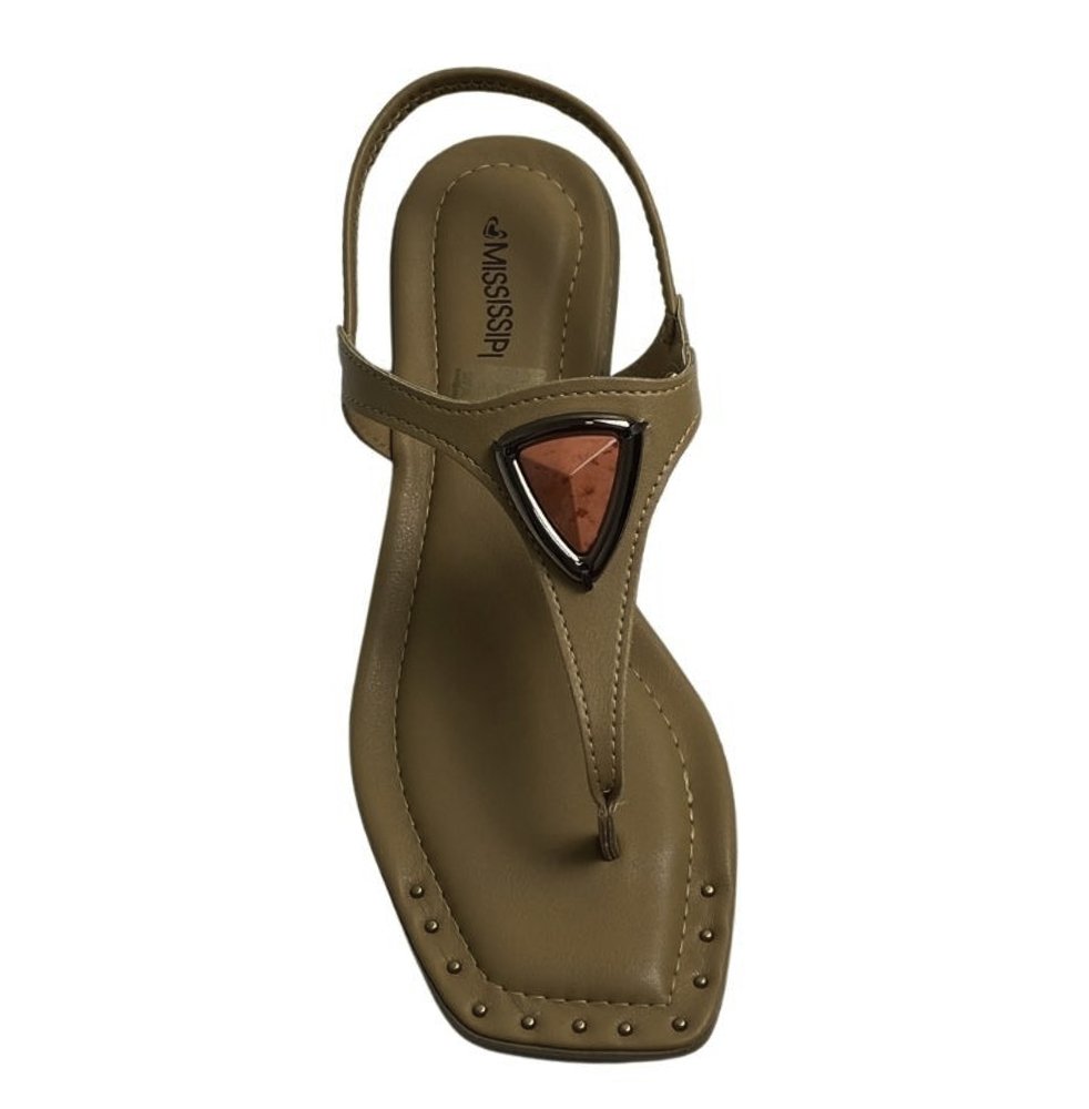 Ref: A sandália Mississipi eleva o casual com seu design minimalista e toque de sofisticação. O bico de contorno quadrado e o calce fácil, sem fechamentos, garantem praticidade, enquanto a peça metalizada com pedraria orgânica sobre o pé eleva seu estil