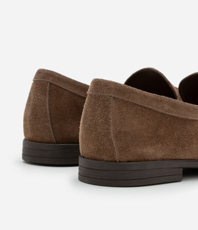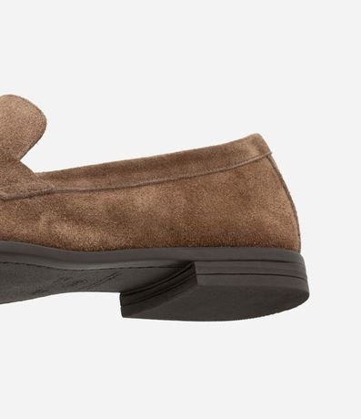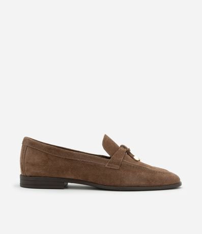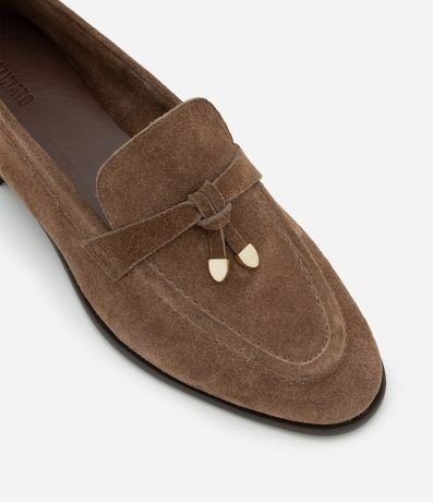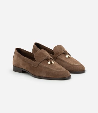 Ref: Par de mocassins com cabedal de camurça legítima. O sapato tem bico amendoado, salto baixo e detalhe de ponteiras metálicas.