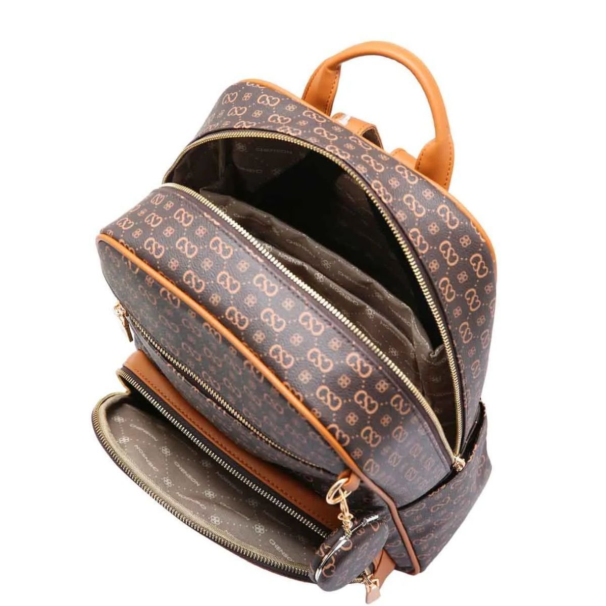 Confeccionada em PU, material de excelente qualidade, esta linda mochila possui compartimento para laptop, iPad e pequenos objetos. O forro e feito em tecido personalizado com o logo Chenson, e o fechamento principal e realizado por um ziper personalizado. Suas alcas em PU e o chaveiro espelho Chenson adicionam um toque de sofisticacao. Com acabamento em costura contrastante e detalhes das ferragens em dourado, esta mochila e perfeita para quem busca praticidade e elegancia. Especificacoes: Tamanho: Unico Marca: Chenson Genero: Feminino