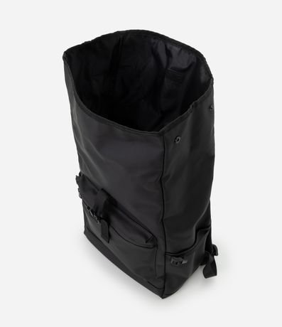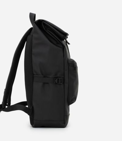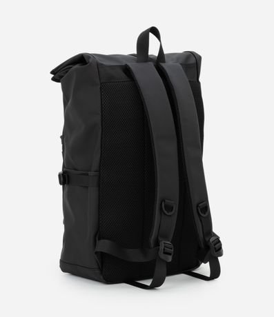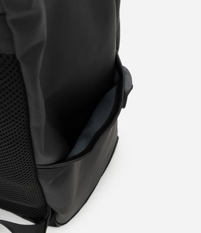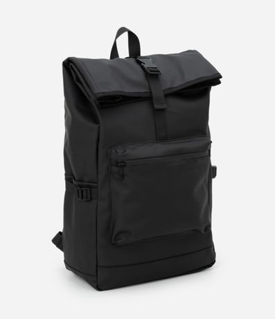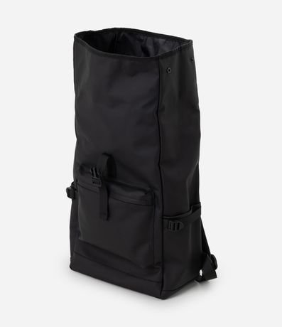 Mochila em PVC emborrachado com fechamento ajustável por lapela e fivela. Possui bolso frontal com zíper, laterais com regulagem e alça superior para transporte, além de bolso interna e duas divisões para auxiliar na organização. O item oferece espaço interno amplo para diferentes usos.
