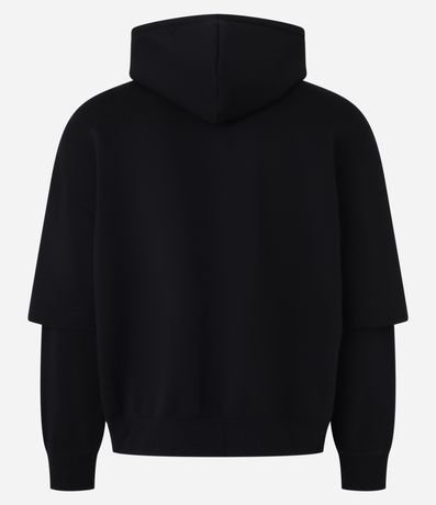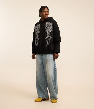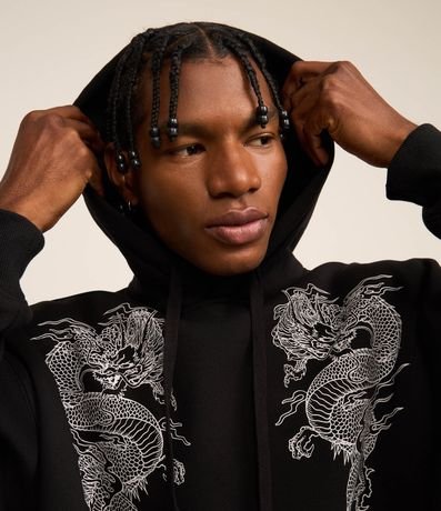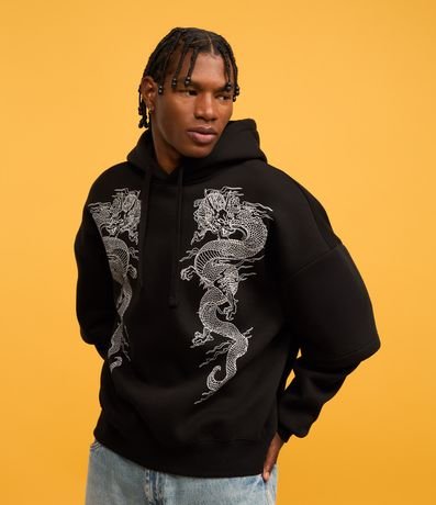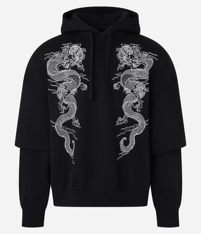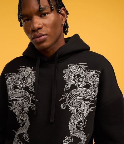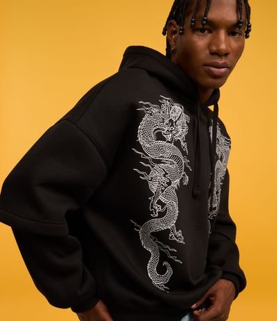 Ref: Moletom boxy em fleece. Possui capuz com cordão ajustável, estampa de dragões e mangas sobrepostas.
