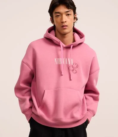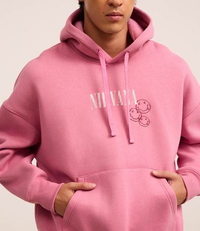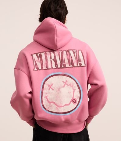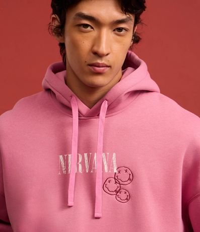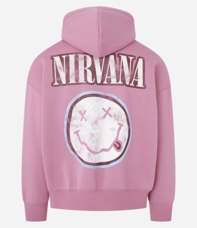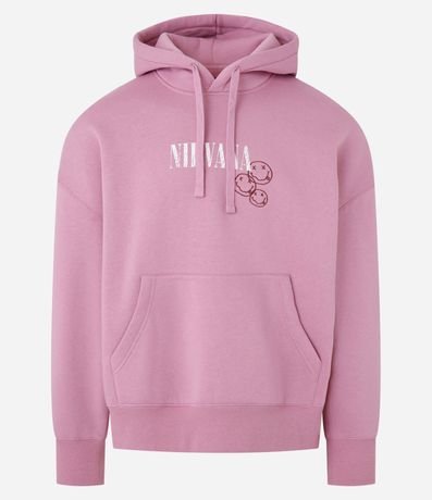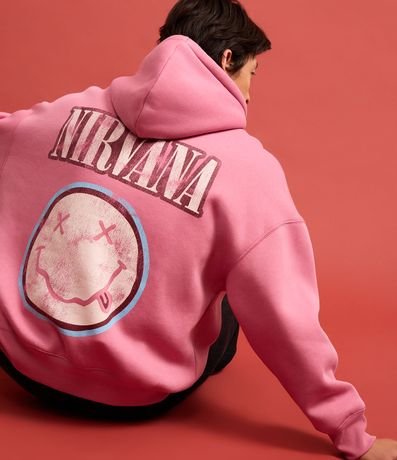 Moletom masculino confeccionado com material mais sustentável, capuz com cordinha para ajuste e manga longa ajustada. Peça no modelo boxy com bolso canguru e estampa icônica da banda Nirvana.
