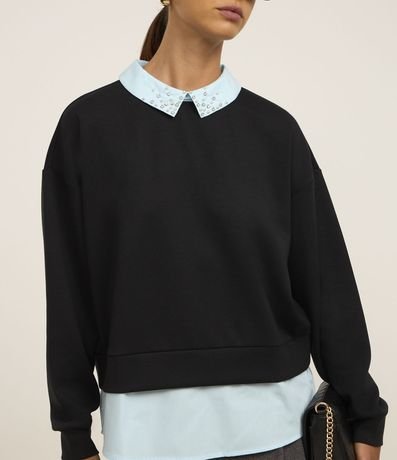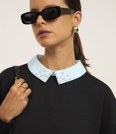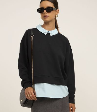 Ref: Moletom feminino de modelo fechado, sem felpa e sem estampa. Possui diferencial de barra e gola camisa, com abertura V nas costas e aplicação de strass hotfix na gola.