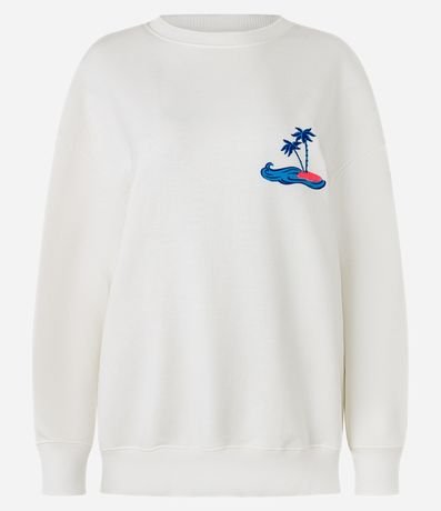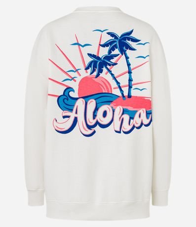 Moletom feminino amplo, de modelo over, com gola redonda e forro em fleece. Possui barra e punhos canelados e estampa de praia no peito e costas, com lettering "Aloha".