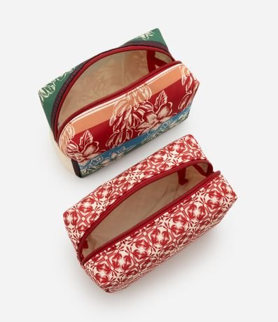 Ref: Necessaire feminina 3 em 1 com uma peça grande em PVC transparente com bordas contrastantes e duas menores em tecido estampado, cada uma com zíper resistente e formatos estruturados que facilitam organização.