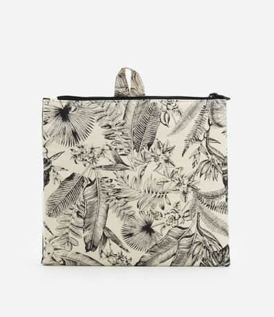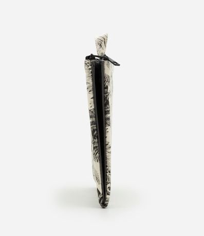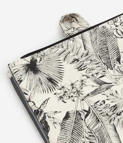 Necessaire envelope com divisórias, alça e estampa de folhagem.