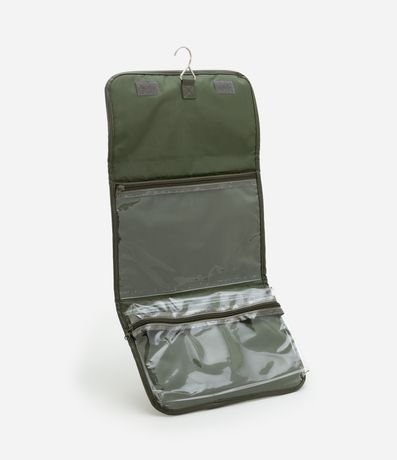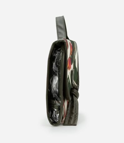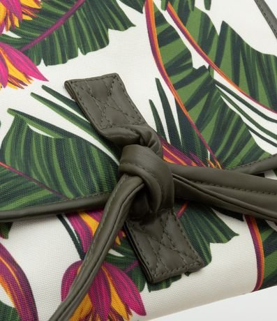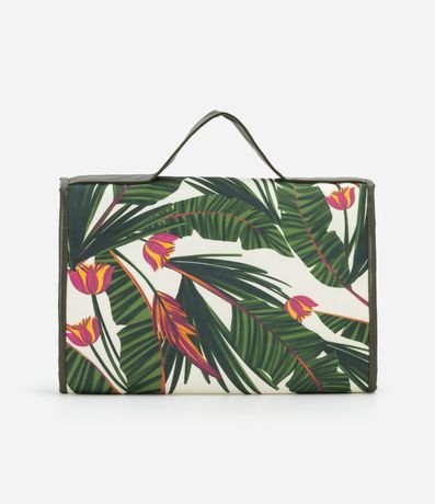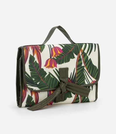 Ref: Nécessaire hotel com alça de mão, estampa de folhagem, divisórias internas e gancho para pendurar. Peça com detalhe de laço frontal.