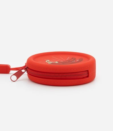 Ref: Nécessaire porta moedas, confeccionado em silicone, com alça de mão, fechamento por zíper e pimentas estampadas.