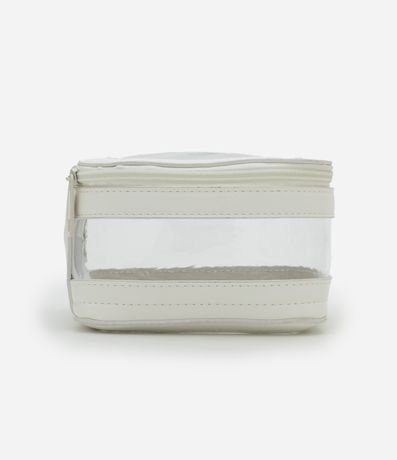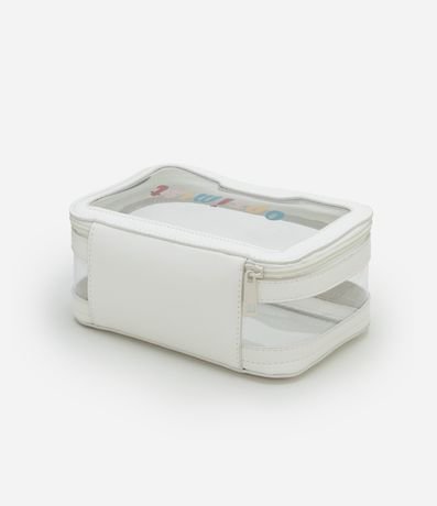 Nécessaire retangular grande com fechamento por zíper, peça com transparência e lettering com estampa Optimist.