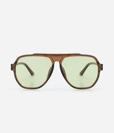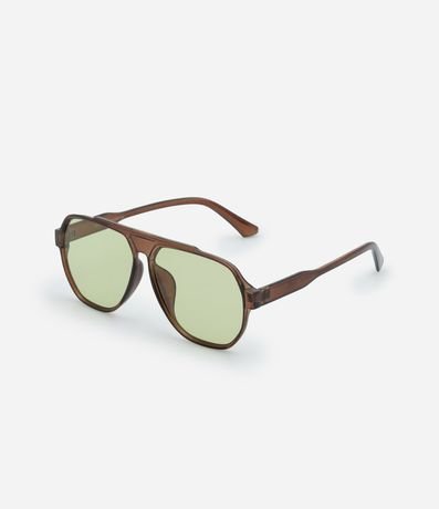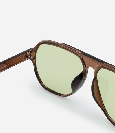 Óculos com armação translúcida, design marcante no estilo aviador, apresentando ponte dupla e linhas levemente angulares. As hastes são finas, com curvas suaves.