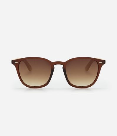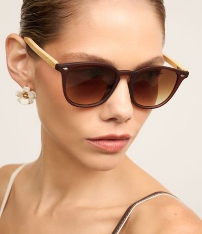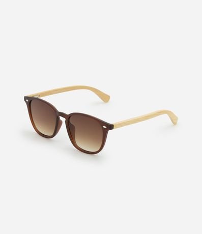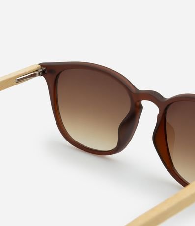 Óculos de sol, modelo quadrado, com haste de bambu, lente fume e rebite na charneira.