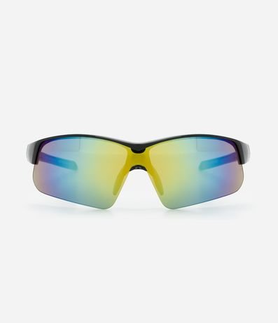 Óculos de sol esportivo modelo com curvatura, lente sobre pressão, ponte anatômica e lentes espelhadas. Produto contém proteção contra raios UVA / UVB