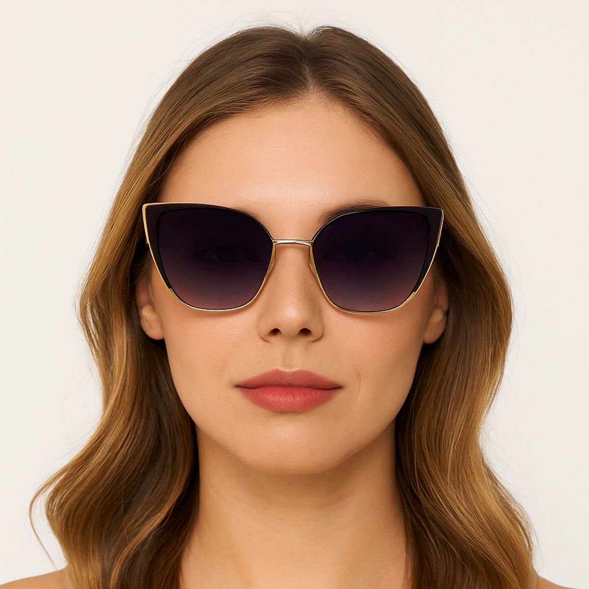 Transforme seu visual com o óculos de sol feminino estilo borboleta, com armação dourada sofisticada e lentes roxas degradê, que oferecem proteção contra raios UV e conforto durante o uso. Um modelo elegante e moderno, ideal para compor looks cheios de personalidade em qualquer ocasião.