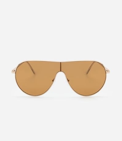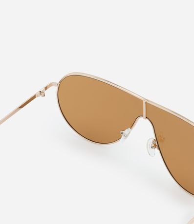 Ref: Óculos de sol feminino modelo mascara com lentes lacrimais, lente marrom total e hastes finas. Produto confeccionado em metal reciclado com proteção UVA/UVB.