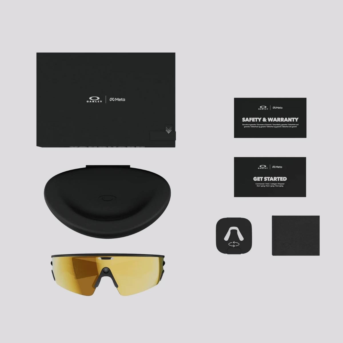 Contém: 01 óculos de sol, 01 estojo de carregamento, 01 bolsa de microfibra, apoios de ponte nasal alta e baixa e 01 guia de referência