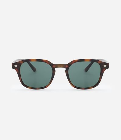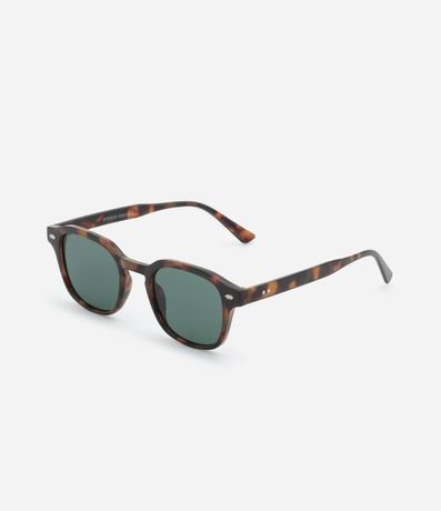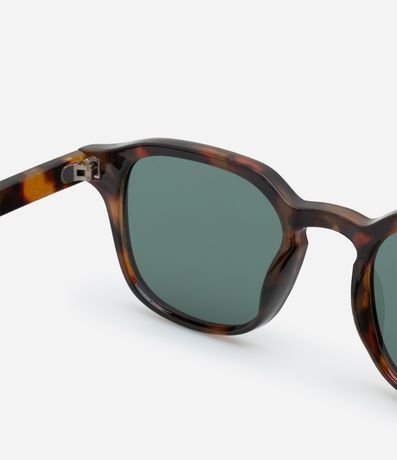 Ref: Óculos de sol feminino pequeno, modelo quadrado, com armação retangular, hastes largas facetadas e lentes fumê com efeito tartaruga.