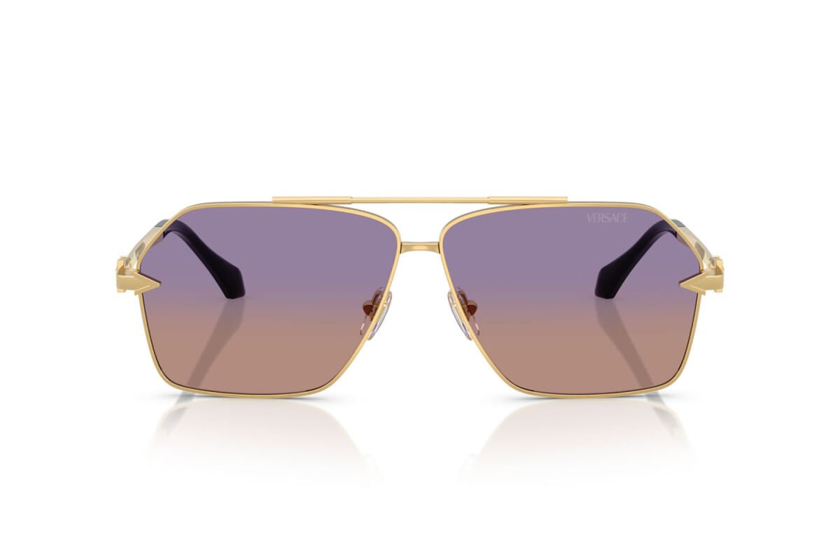 A armação ouro e as lentes degradê violeta e laranja com metade transparente