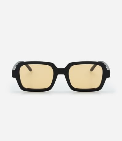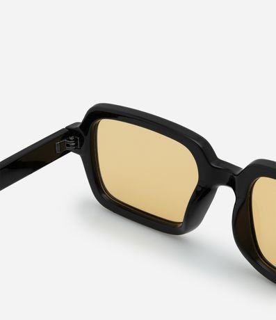 Óculos de sol no formato quadrado. Possui bordas suavizadas, acabamento fosco, lentes amareladas, hastes largas na junção com a frente e afinadas em direção às orelhas, além de dobradiças metálicas embutidas.