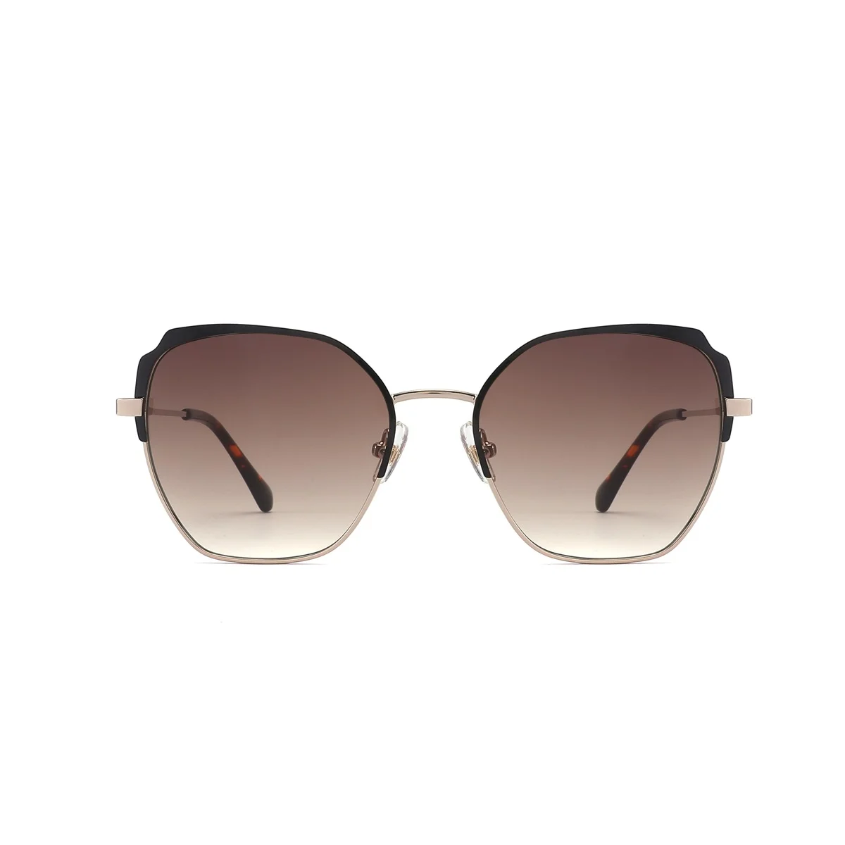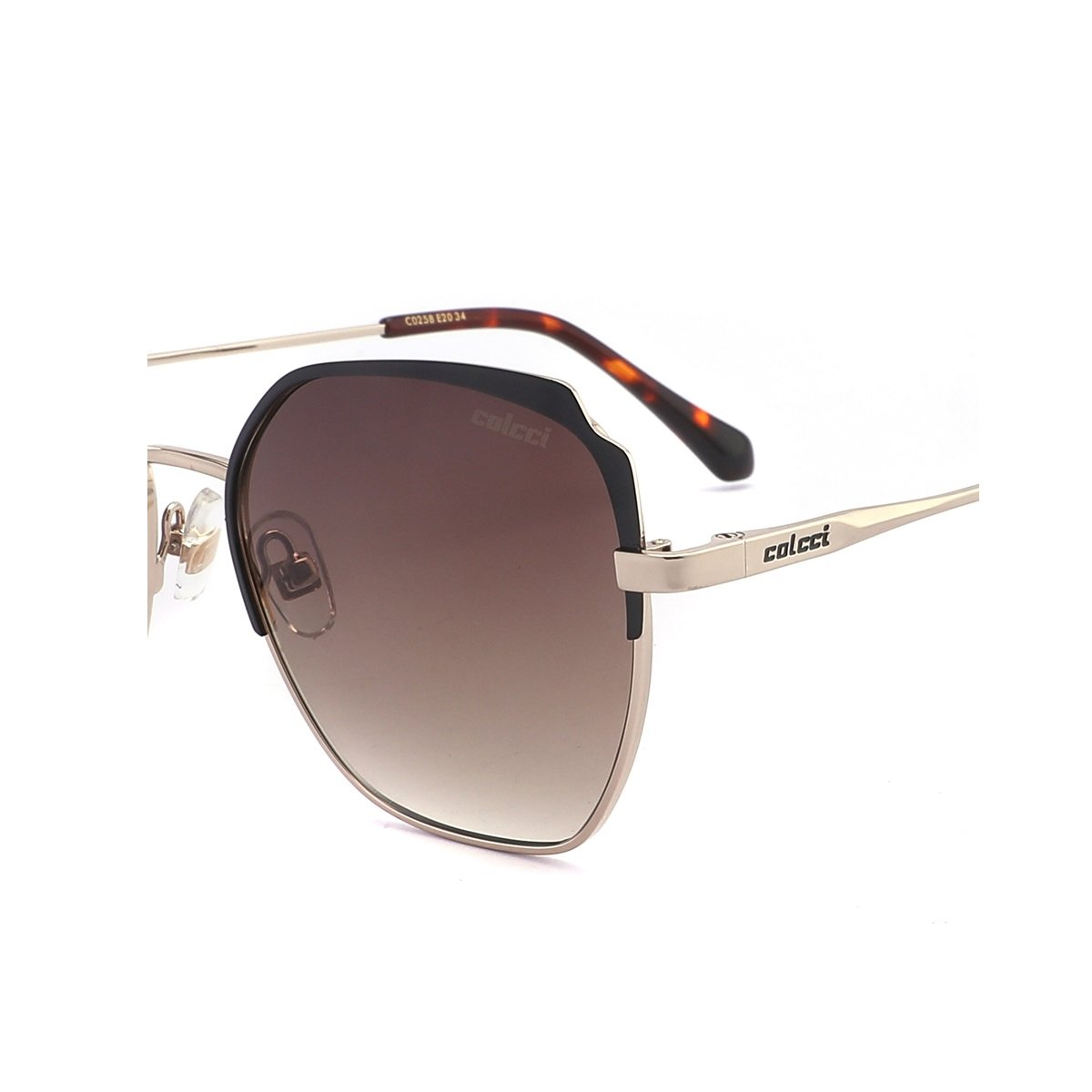 O oculos e fabricado em Metal na cor Dourado Brilho com hastes na cor Dourado conta com lentes em Policarbonato com 100% de protecao UVA e UVB na cor Marrom Degrade.