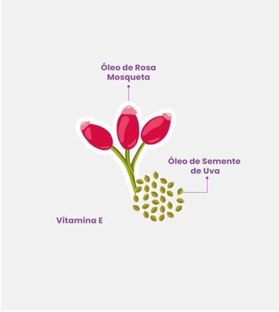 Ativos principais: Óleo de Rosa Mosqueta Óleo de Semente de Uva Vitamina E Composição: Vitis Vinifera Seed Oil, Laureth-3, MIPA-Laureth Sulfate, Laureth-7 Citrate, Isopropylamine Dodecylbenzenesulfonate, Parfum, Rosa Aff Rubiginosa, Tocopheryl acetate, Benzyl Benzoate, Linanool, Limonene, Benzyl Salicylate, Hidroxycitronellal, Citral, Coumarin, Geraniol, Citronellol, Benzyl alcohol.