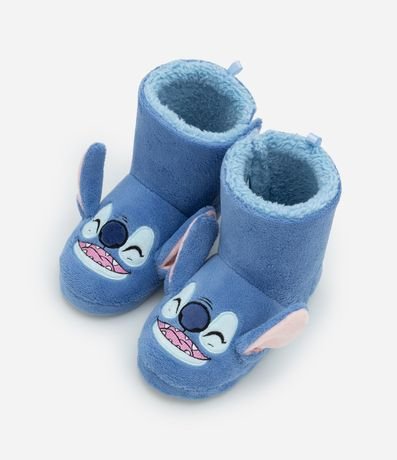 Pantufa infantil modelo bota com bordado do Stitch, com orelhinhas e fechamento lateral por velcro.
