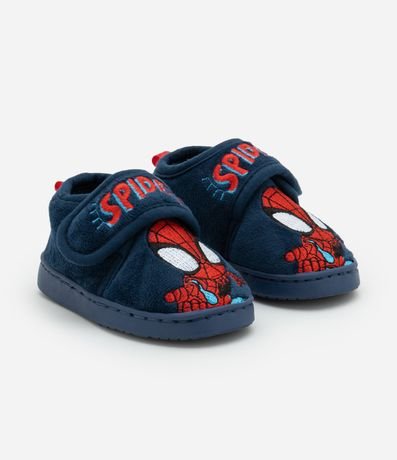 Ref: Pantufa infantil de modelo fechado, com solado, bico redondo, fechamento por velcro e bordado do Homem Aranha Spidey.