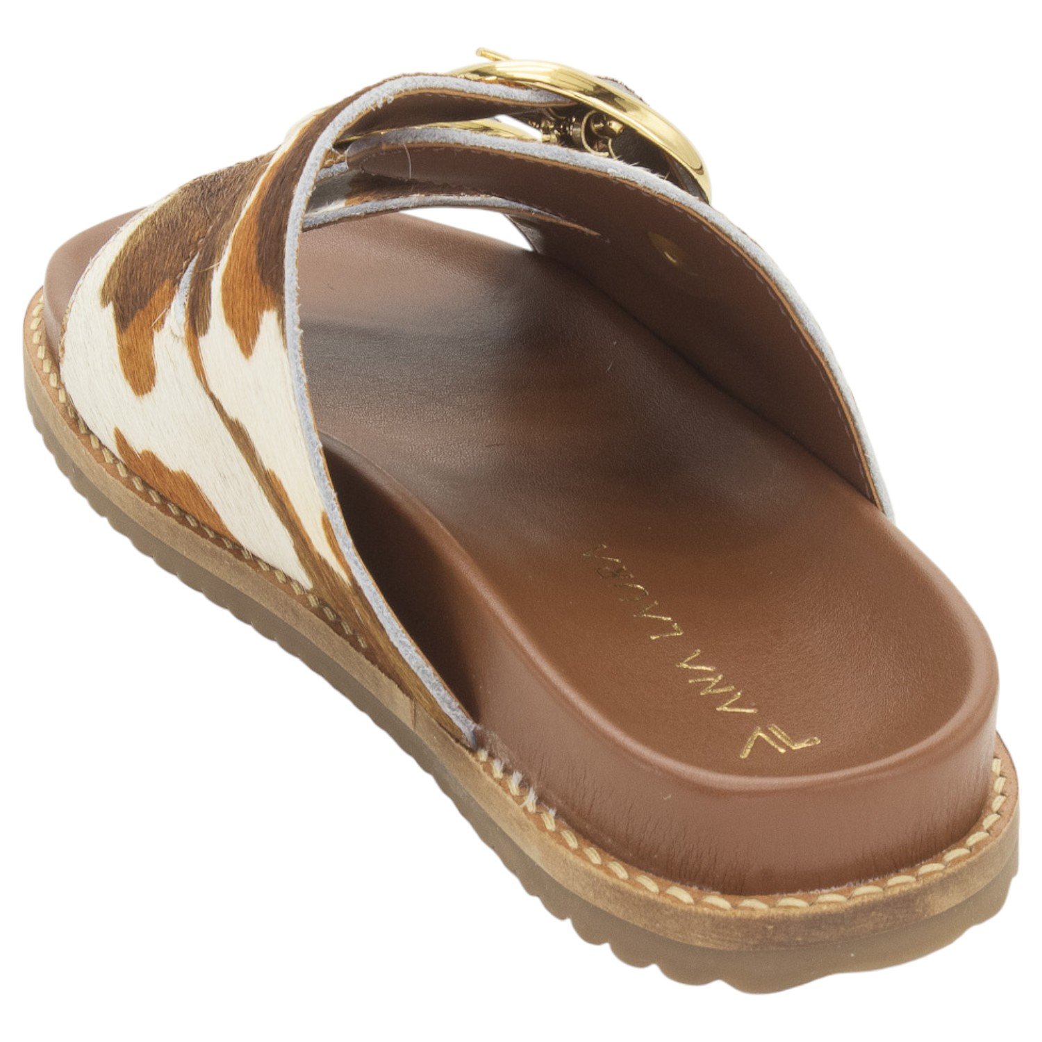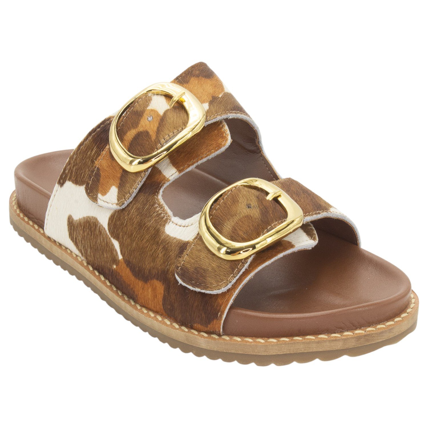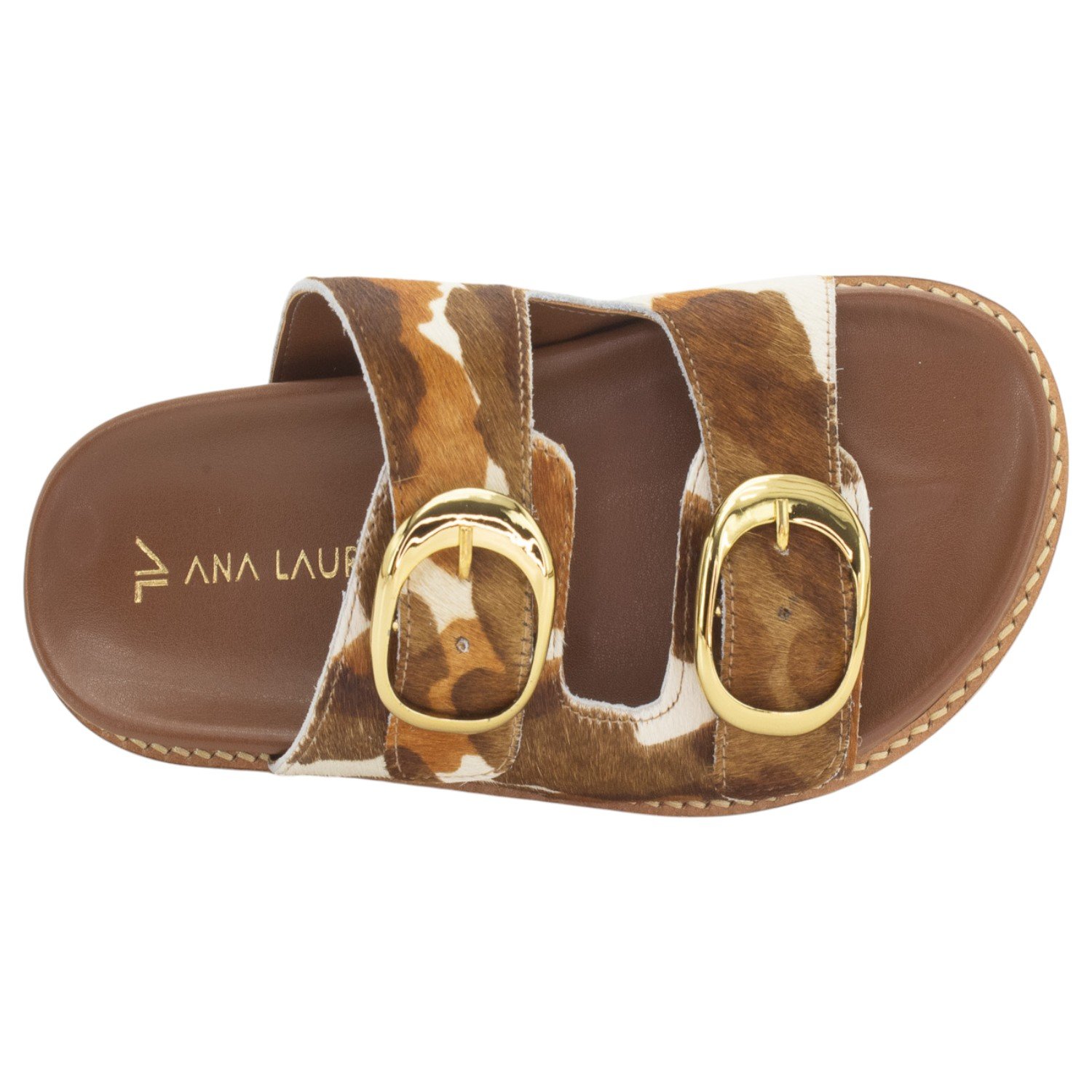 Ref: Esta elegante Papete Feminina Ana Laura é um calçado que harmoniza conforto e a tendência do animal print em um design no estilo slide de duas tiras. O grande destaque é o seu cabedal em couro natural com pelo (também chamado de hair on), que exibe uma rica e atraente estampa mesclada em tons de marrom, caramelo e branco. A sofisticação é acentuada pelas duas fivelas grandes e arredondadas na cor dourada, que além de serem um detalhe visual marcante, permitem um ajuste prático e personalizado sobre o peito do pé. Pensando no bem-estar, a papete possui uma palmilha na cor marrom, que é projetada para ser acolchoada e anatômica, proporcionando o máximo de conforto para o uso prolongado. Finalizando o design funcional, o solado é emborrachado com ranhuras antiderrapantes, garantindo segurança e estabilidade ao caminhar, tornando este modelo a escolha perfeita para quem busca um toque de personalidade e estilo moderno para o dia a dia.