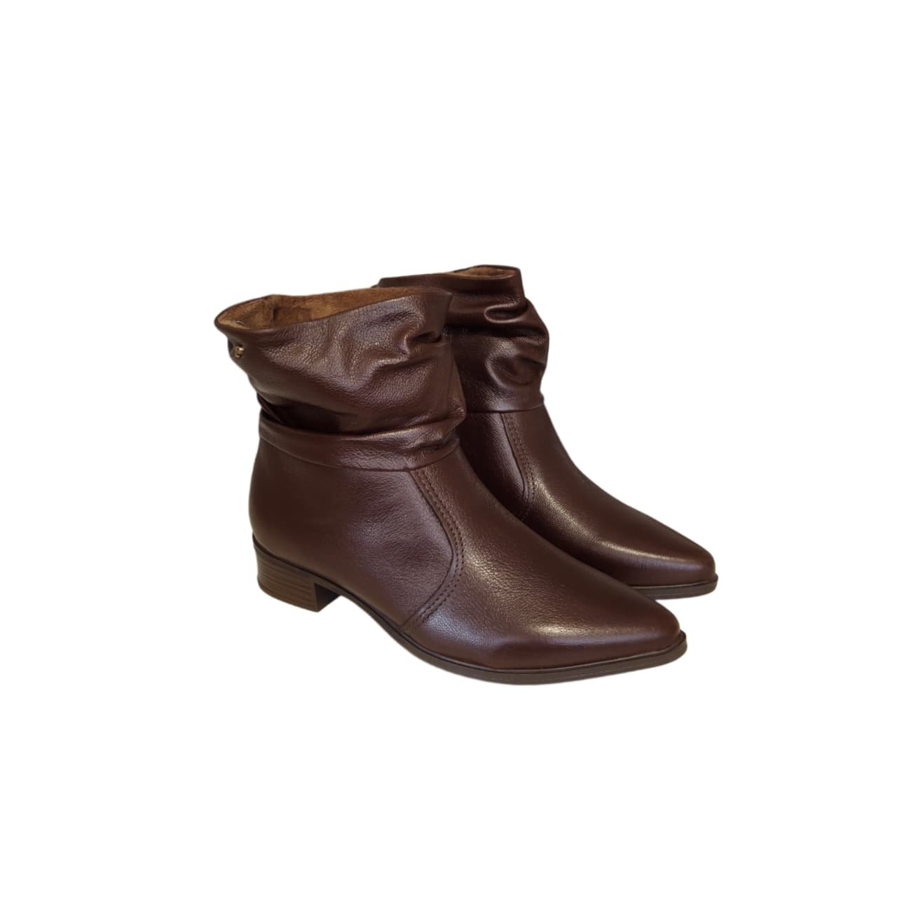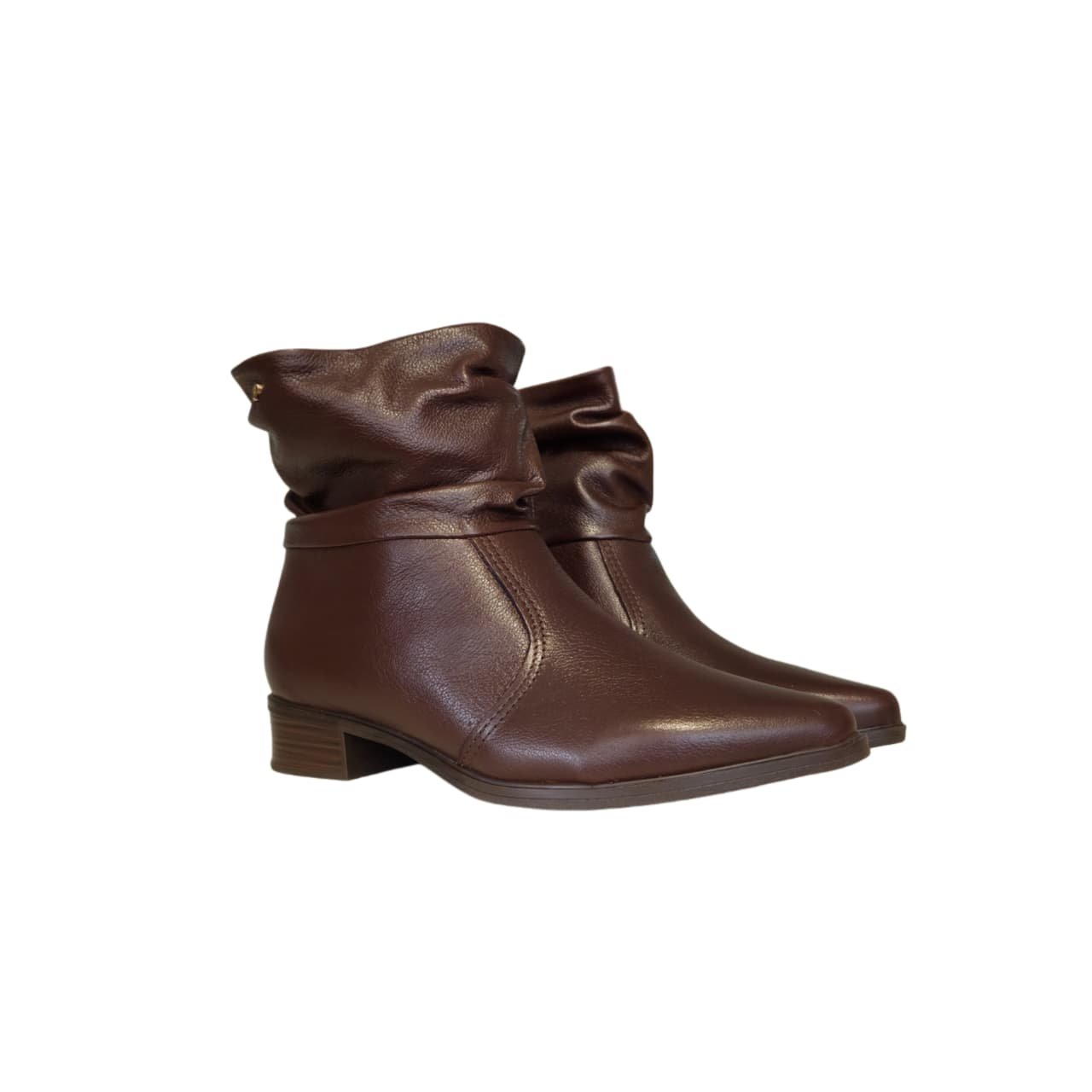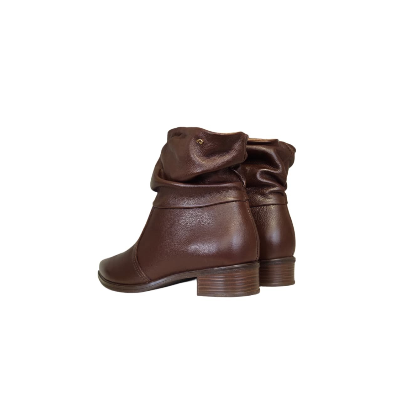 Salto Estilo Montaria (2,5 cm): Oferece uma elevacao minima e extremamente confortavel, ideal para quem precisa de um calcado estavel para o uso continuo. Fechamento em Ziper: Localizado na lateral interna, o ziper facilita o calce. Um detalhe importante e que ele chega ate o terco final do cano, mantendo a estrutura franzida do cabedal sempre alinhada e estilosa. Couro Legitimo: Garante durabilidade, resistencia e a adaptacao natural ao formato do pe.