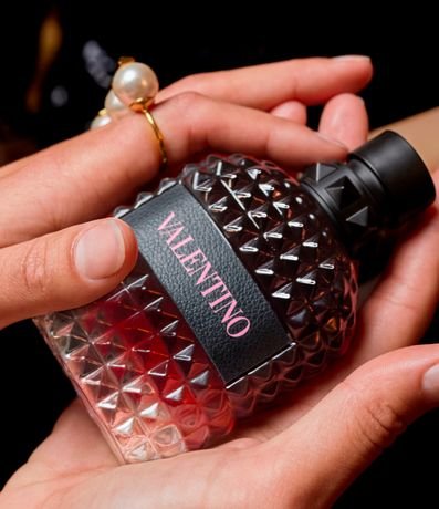 Born In Roma Intense permite que os jovens descolados se expressem com intensidade e vivenciem a vida com abundância e dualidade. Essa fragrância icônica desafia de forma divertida a rivalidade entre o dia e a noite, o clássico e a intensidade e você e eu. O frasco presta homenagem ao icônico Valentino Rockstud. Esse design piramidal arrojado, inspirado na arquitetura romana, é uma assinatura da Maison Valentino. Parte da iconografia da moda de Valentino e um símbolo de Roma, onde embeleza as portas e paredes da cidade, o Rockstud é um símbolo transformador, que leva uma bolsa ou um sapato do clássico ao instantaneamente atual. O frasco com a ousada estampa de pedra ficou ainda mais moderno graças ao contraste do couro preto com o rosa vivo. Porque em Valentino, o rosa é punk e poético, romântico, mas também ousado e audacioso. Não há regras.