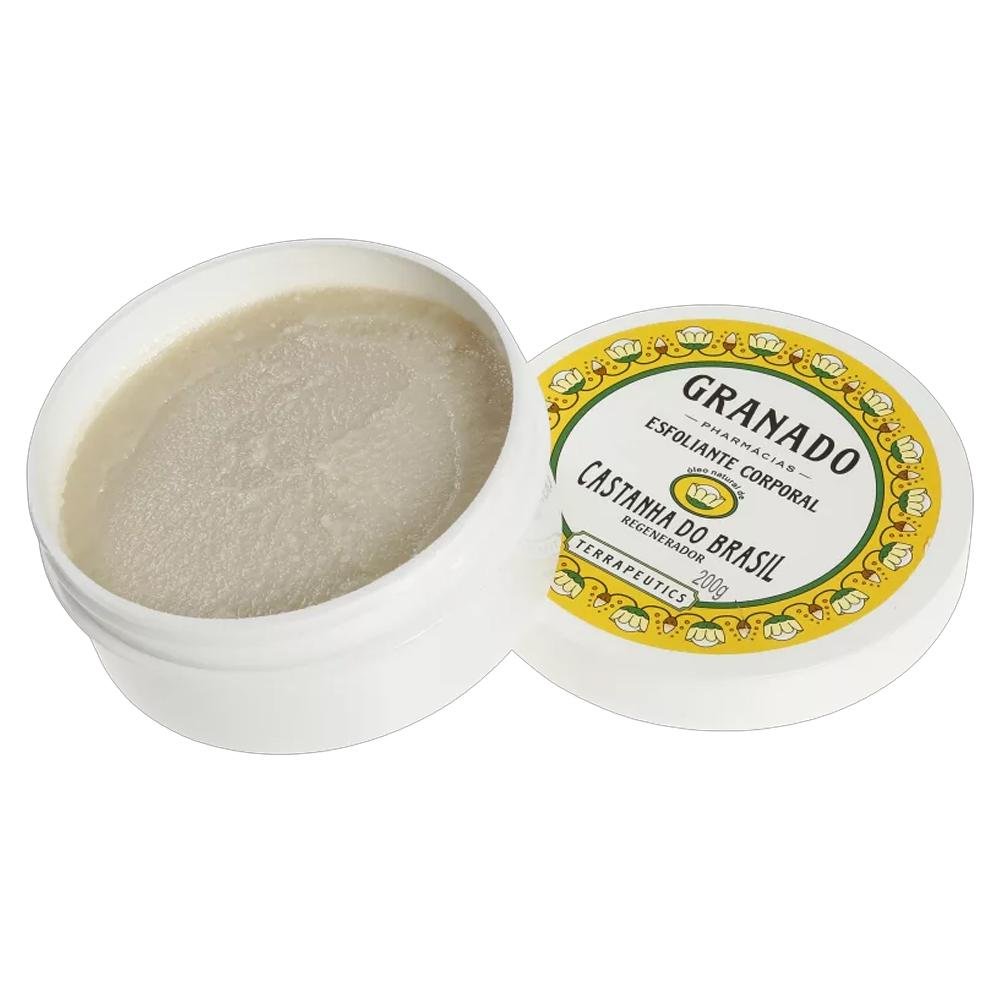 Esfoliante nutritivo com extrato de castanha, que remove células mortas e hidrata levemente a pele.
