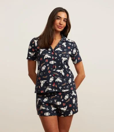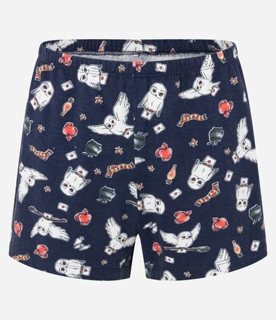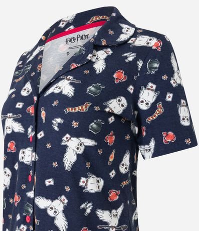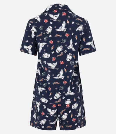 Ref: Conjunto de pijama americano confeccionado em algodão BCI. São duas peças estampadas com a corujinha Edwiges (ou Hedwig) e outros elementos relacionados ao universo Harry Potter.